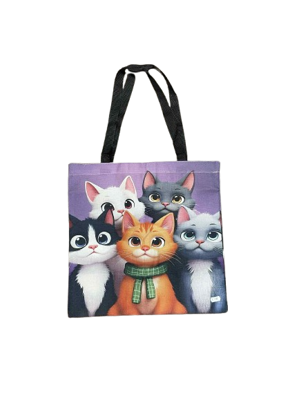 Carry your essentials in style with this adorable Cat Friends Tote Bag, featuring five charming cartoon cats with big expressive eyes and a warm colour palette. Perfect for cat lovers, this eco-friendly canvas bag makes a delightful everyday shopper or gift. Durable handles and vivid print make it both practical and irresistibly cute – ideal for groceries, school, or casual outings.