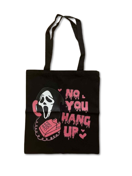 Add a killer twist to your everyday style with the “No, You Hang Up” Ghost Face Tote Bag. Featuring the iconic masked figure mid-phone call, this black tote blends horror-movie nostalgia with playful pink retro vibes. Perfect for carrying books, groceries, or your next slasher marathon essentials, this sturdy cotton bag is both spooky and stylish.